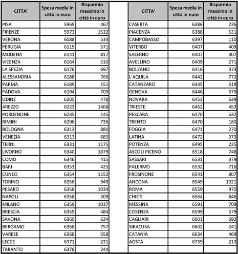 Lo strumento di valutazione è l’indice di convenienza, stilato registrando 898mila prezzi che hanno coinvolto 950 punti vendita – 162 ipermercati; 603 supermercati, 185 hard discount. Sulla base dell’indice è stata stilata la classifica nelle diverse città. Nel valutare i diversi scenari possibili di acquisto e di possibilità di risparmio sono stati creati dei carrelli-tipo, sia considerando 531 prodotti di marca, freschi, di ben 104 tipologie diverse (come biscotti, frutta, detersivi, bibite), sia scegliendone la versione a scaffale più economica in assoluto. L’indice più basso, base 100, è stato assegnato al punto vendita in assoluto meno caro, trovato ad Arezzo. Sul sito Altroconsumo disponibili tutte le informazioni dell’inchiesta. Le tensioni concorrenziali tra diversi punti vendita in città giocano a favore delle possibilità di risparmio per il consumatore; è quello che succede a Pisa, dove la spesa media è la più bassa di tutte le 61 città analizzate: 5.969 euro, seguita da Firenze e Verona (vedi classifica convenienza a seguire). Più alta è la sfida tra prezzi a scaffale, più bassi diventano i prezzi; così la possibilità di risparmio – la forbice della spesa tra il punto vendita più caro e meno caro – aumenta per il consumatore. È quanto succede in Toscana, Umbria e Veneto, Emilia Romagna. Pecore nere: Trentino, Val d’Aosta, il centro-sud e le isole maggiori, dove invece langue la battaglia tra insegne. Nelle possibilità di risparmiare quando si fa la spesa non gioca solo la tipologia di punto vendita e l’insegna; scegliere se approfittare delle offerte oppure abbandonare il prodotto di marca può portare a risparmi inauditi: 24% di spesa in meno se si scelgono i prodotti di marca in offerta; 38% in meno se si opta per i prodotti col marchio dell’insegna del supermercato; 55% di esborso in meno se i prodotti sono sempre quelli primo prezzo; ben 61% in meno se si abbandonano i prodotti di marca, scegliendo l’HD. Sino a ridurre la spesa in un anno di 3.500 euro.