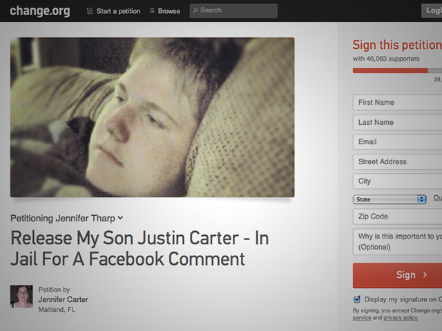 Justin Carter , 19 enne del Texas è dietro le sbarre da marzo per aver inviato un commento minaccioso su Facebook a uno dei suoi amici durante una discussione su un videogioco online. Secondo il padre di Justin, Jack Carter, suo figlio sarcasticamente ha risposto ad un amico che lo ha chiamato “pazzo” scrivendo “Oh sì, sto veramente perdendo la testa. Ho intenzione di andare a sparare in una scuola piena di bambini e mangiare il loro cuore ancora pulsante. ” Il padre ha aggiunto che il figlio ha seguito il suo commento scrivendo “LOL” e “J / K” per mostrare che stesse scherzando. Le autorità si sono affrettati ad agire in seguito alla segnalazione da parte di una donna, soprattutto dopo la sparatoria in una scuola elementare a Newton, nel Connecticut. Justin si trova ad affrontare fino a otto anni di carcere per aver reso una minaccia “terroristica”. Utilizzando l’hashtag # FreeJustinCarter, si sta discutendo se la punizione di Justin è ingiusta o del tutto giustificata.