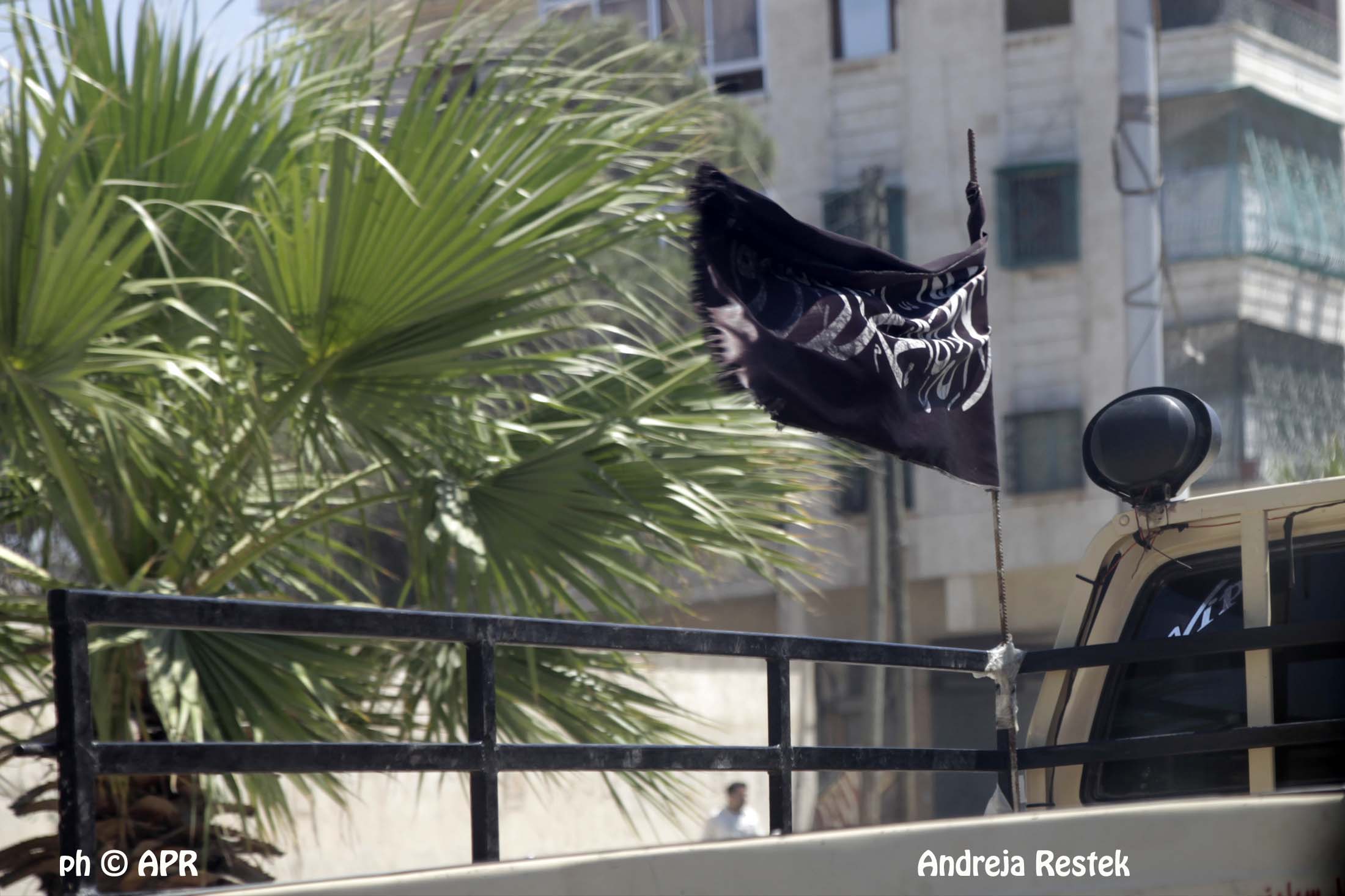Aleppo – Certi drappi neri che sventolano a macchia di leopardo sui quartieri della città, magari non subito associabili ad una o all’altra brigata impegnate nella guerriglia, cominciano a preoccupare e lo si capisce dalla tensione che subentra in alcuni combattenti del Free Syrian Army quando li incontrano. Le macchie di leopardo qualche mese fa erano i cecchini che sparavano a tutto quello che si muoveva e che ci sono ancora, ma insieme a loro ci sono anche i signori che sono venuti a combattere e morire e che non amano i giornalisti né le macchine fotografiche. Sono diversi dai ragazzi del Free Sirian Army che desiderano che si racconti delle sofferenze del popolo Siriano di cui fanno parte. Potrebbe essere che uno non si fosse accorto di queste bandiere nere mesi fa perché vedeva tutti i giorni troppi morti e feriti, ma sicuramente poteva sfuggire qualche bandiera nera dello stato islamico, ma non tutte. Ad accomunare quelle bandiere è il colore nero di fondo, ma le differenze sono notevoli e non stanno solo nei due fucili stampati su quella che sventola sulla linea aperta a ridosso di una scuola sventrata, dove combattono i giovani della katiba Abu Ali Sleba o nel cerchio bianco che distingue quella dell’Islamic State of Iraq e Syria che se controlla una zona della città ne mostra i simboli all’ingresso e in uscita. Gli uomini del Fsa combattono nelle stesse strade e la stessa guerra, ma con modi diversi di farla o di intenderla. Si percepisce la diversità di intendere e combattere questa guerra per esempio quando un drappello di uomini, sotto un vessillo nero, tenta il rapimento di un giudice in un quartiere abitato. E’ capitato non più di cinque giorni fa presso la corte civile di Al Mashad, poi occupata, tutto a causa di trattative riguardanti il sistema di leggi che il magistrato avrebbe condotto sul filo sottile che separa il diritto civile da quello islamico. A farlo diventare un obiettivo e fargli rischiare di sparire sarebbe bastato tanto. Al punto da far ammettere a qualcuno del Fsa che “finita questa guerra ci sarà da risolvere un’altra questione” e sarà quella per tenere distinte politica, giustizia civile e religione.