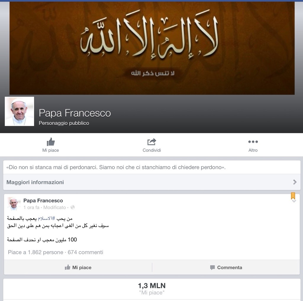Un hacker si è inserito nella pagina Facebook (assolutamente non ufficiale) di Papa Francesco. A prima vista sembrerebbe che il pirata informatico sia di fede islamica: «Io testimonio che non c’è altro dio che Allah e che Maometto è il messaggero di Dio». Post di questo calibro sono apparsi sulla pagina del social network che raccoglie più di un milione e trecentomila “mi piace”, pur non essendo mai stata autorizzata dalla Santa sede, la cui unica espressione ufficiale sui social è il profilo twitter @pontifex.