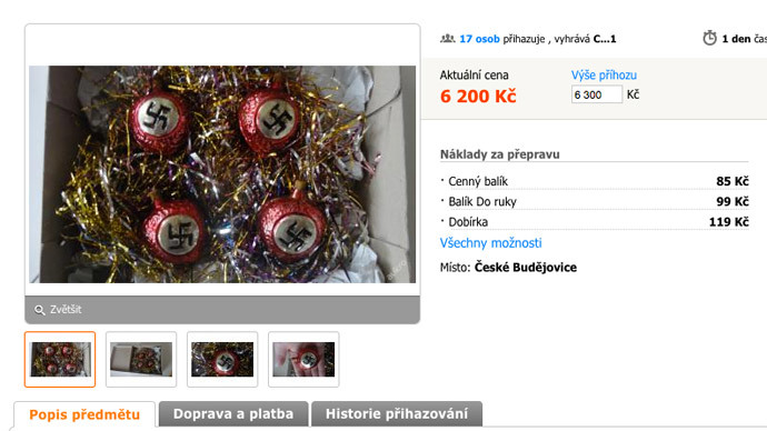 Alcune decorazioni di Natale naziste sono state messe in vendita su un sito di aste (Aukro) suscitando l’indignazione pubblica. L’utente, noto come Anti95, ha pubblicato il seguente annuncio sul sito: “Vendo decorazioni natalizie delle truppe delle SS. Tutto nello stato originale. Non danneggiate. Gli ornamenti sono nei colori originali e in ottime condizioni, con lievi usure dovute all’età. Si tratta di pezzi rari”.