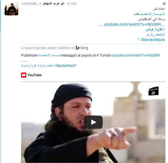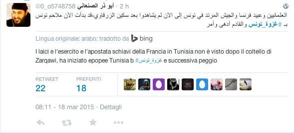 Gli account in lingua araba raccolgono, intorno a specifici #hashtag, i commenti a favore dell’attentato e dello Stato Islamico, che negli scorsi mesi avevano diffuso dei video che invitavano all’attacco in Tunisia.