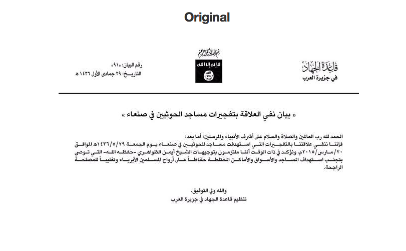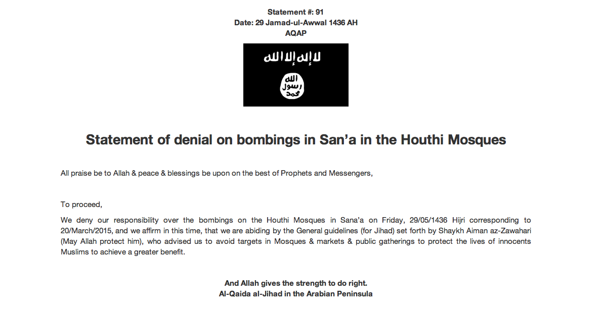 Nella sua dichiarazione, negando ogni legame con gli attentati, AQAP ha sottolineato che resta “impegnata alle linee guida” emanate dallo sceicco Ayman al Zawahiri. Tali orientamenti sconsigliano attacchi “alle moschee, mercati e luoghi pubblici per evitare morti di musulmani innocenti, e danno priorità agli interessi preminenti”, secondo la traduzione del messaggio di AQAP.