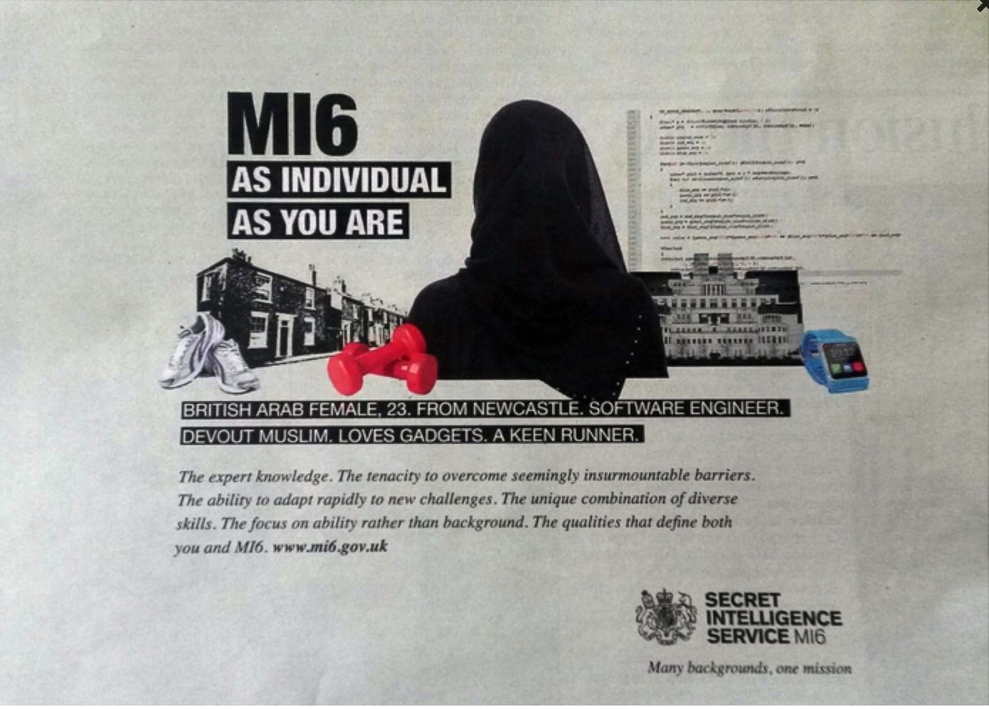 L’MI6, l’agenzia di intelligence esterna, pubblica così il suo profilo ideale per lo ‘007’ sul Times:”Donna, Araba britannica, 23 anni, di Newcastle. Laurea in ingegneria informatica, musulmana, amante dei gadget elettronici, appassionata di jogging”. E quindi l’appello: se hai questi requisiti, contatta il Servizio segreto.