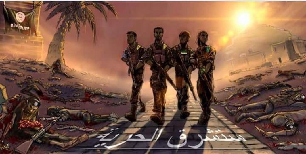 I volantini riportano il disegno di jihadisti morti e della loro bandiera capovolta; quattro combattenti della milizia curda, o YPG, compaiono poi nell’immagine di una strada e nella didascalia, in arabo, si possono leggere le parole “la libertà è in arrivo”.