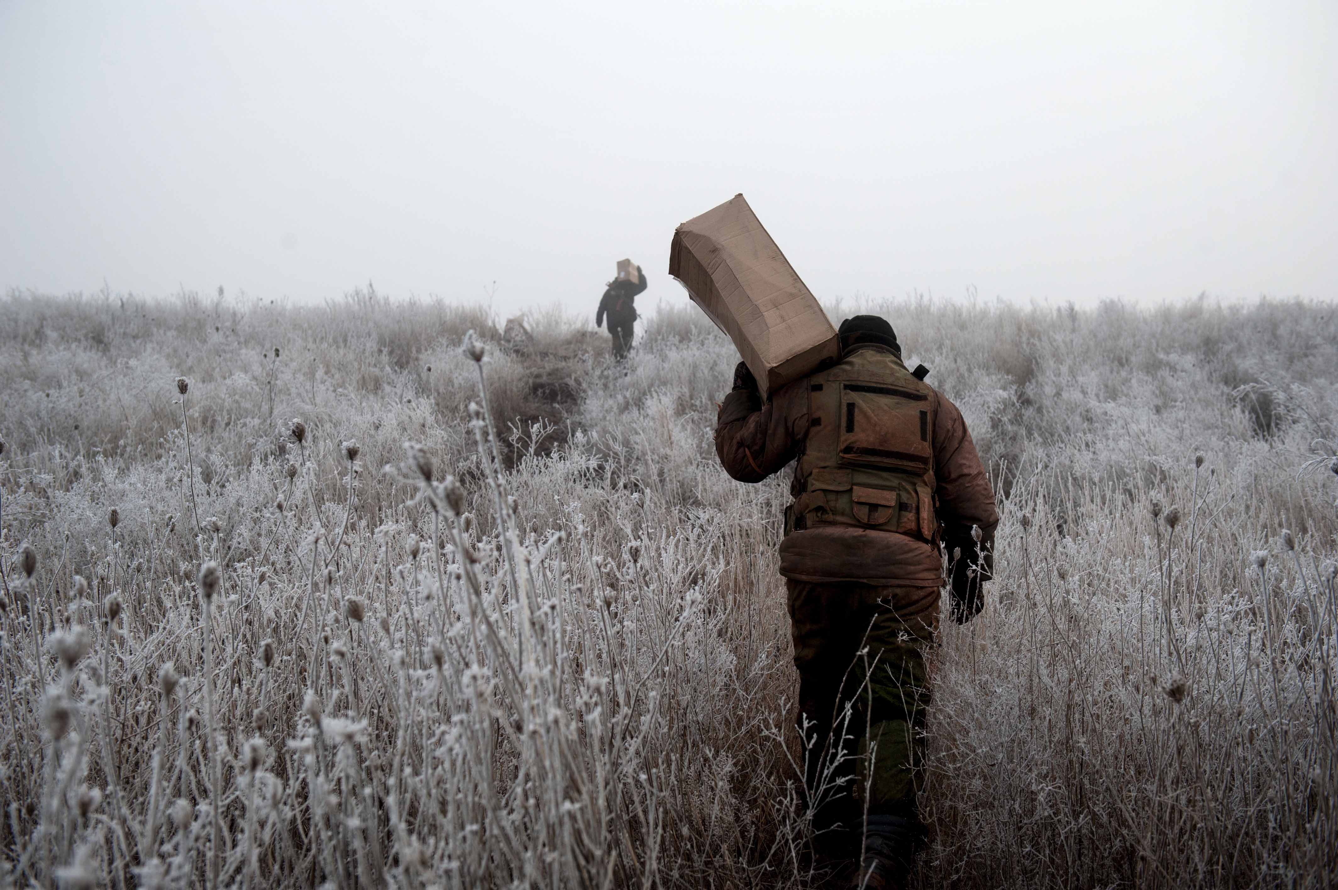 Members of the first artillery brigade Slavic recover supplies provided by their comrades on their different positions around Debaltseve.