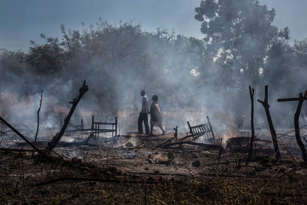 After the bombing in Kauda, a couple walks on the ashes of a house that got torn down. The bombardments destroyed four houses as well as all the crops leaving families with no food until the next recolt in September 2013. Kauda, South Kordofan, Sudan – November 2012