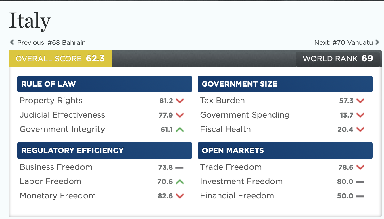 L’Italia si posiziona al 69º posto per la libertà economica nell’Indice 2023. Il suo punteggio è inferiore di 3,1 punti rispetto all’anno precedente.