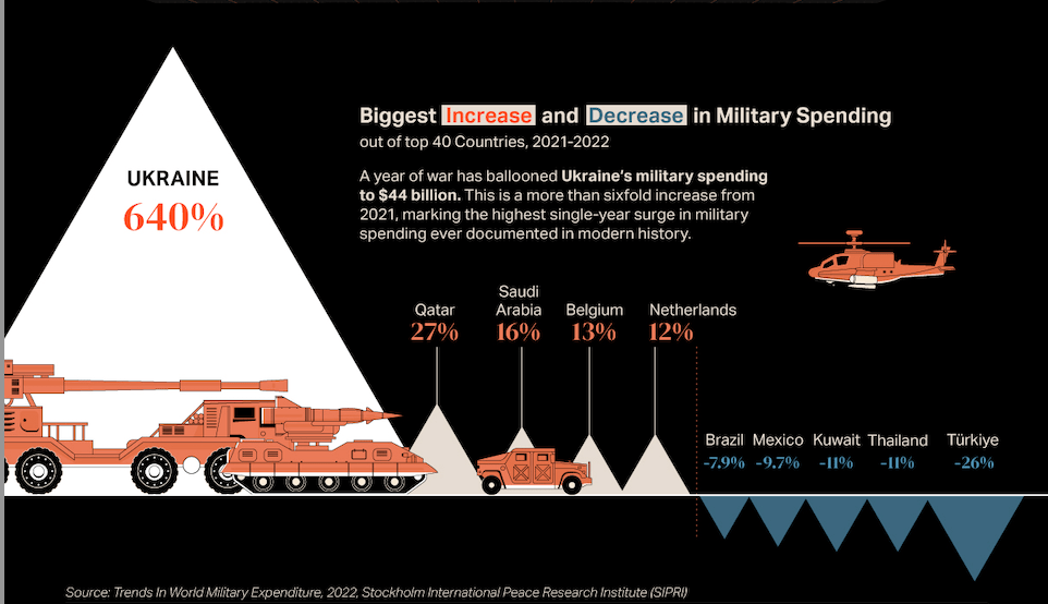 L’Ucraina ha sperimentato il maggior aumento annuale nel budget militare nel 2022, con una crescita di quasi sei volte e mezzo rispetto all’anno precedente. Questo incremento rappresenta il più grande balzo annuale mai registrato dal SIPRI. Infatti, il 40% di tutti i budget militari destinati al paese viene investito nell’Ucraina. Tuttavia, sebbene l’Ucraina sia in cima alla lista degli aumenti di spesa, anche altri paesi come il Qatar hanno registrato un significativo aumento del 27% nel corso dell’ultimo anno.