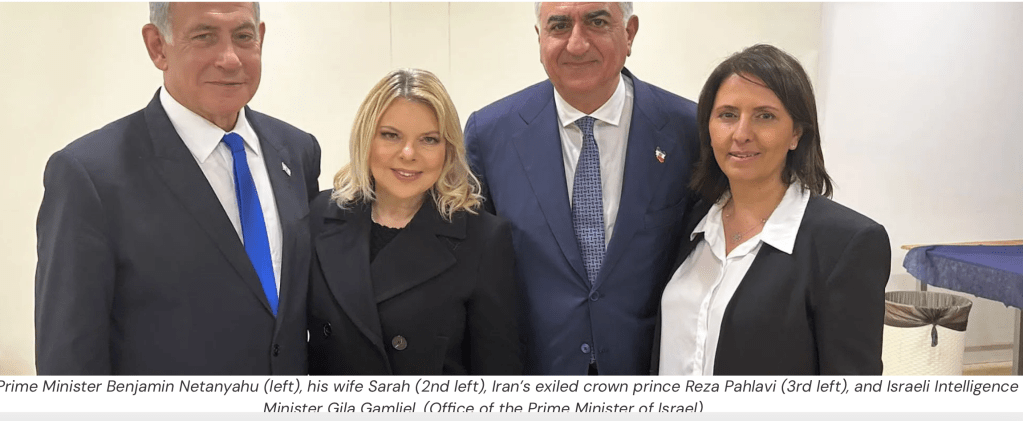 Nel 2023, si è recato in Israele, dove è stato accolto calorosamente da Benjamin Netanyahu e dal ministro dell’intelligence Gila Gamliel. Nel 2017, ha detto ai media statunitensi che nella sua ricerca di “liberare” l’Iran, sarebbe pronto a lavorare “con chiunque sia disposto a darci una mano, che si tratti degli Stati Uniti o dei sauditi o degli israeliani o di chiunque altro”.