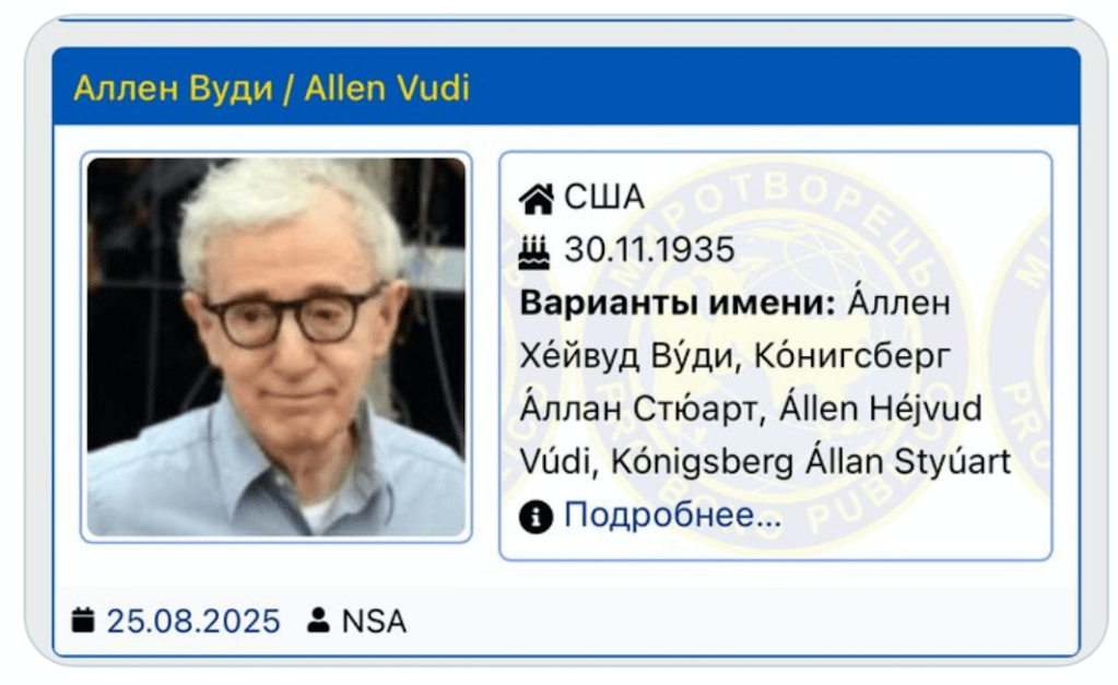 L’inserimento di Woody Allen nella lista nera ucraina Mirotvorets mostra quanto questo strumento sia ormai degenerato: nato con la scusa di difendere la sicurezza nazionale, si è trasformato in una macchina di intimidazione che colpisce artisti, giornalisti e intellettuali.