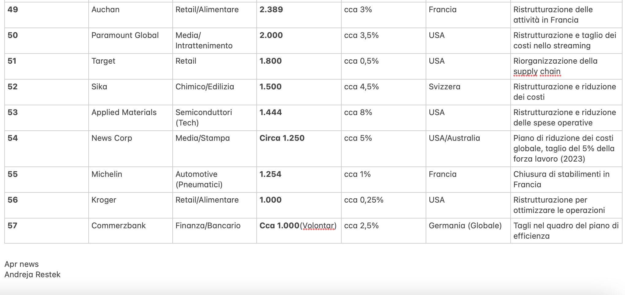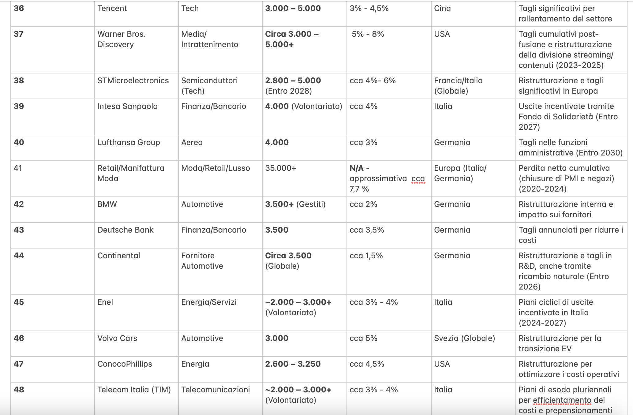 Il totale dei posti di lavoro coinvolti nei maggiori annunci di licenziamenti (stimati) sono tra 780.000 e 920.000 unità nel periodo 2023-2027 e oltre.